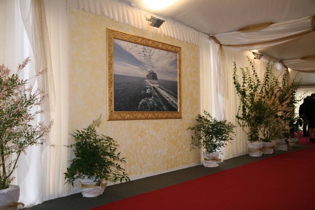 E’ stata realizzata a bordo nave un’area cerimonia di circa 1000 mq, allestita per l’occasione con drappeggi avorio e oro, quadri e cornici dorate raffiguranti le fasi di lavorazione della nave, pavimentazione in legno ignifugo, rivestito di moquette bi-colore, più di 100 esemplari di piante fiorite e sistemi di sicurezza metal detector.
